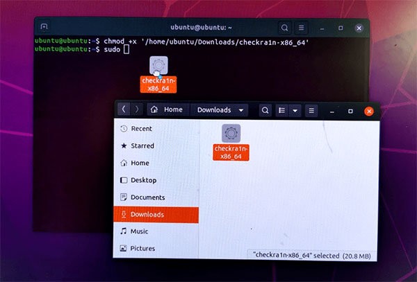 输入「chmod +x 」注意加号前面有个空白键、x 后面也有空白键, 然后将checkra1n 拖入终端机视窗中按下enter。接着输入「sudo 」注意sudo 后面有个空白键,然后再把checkra1n 拖入终端机视窗中按下enter。