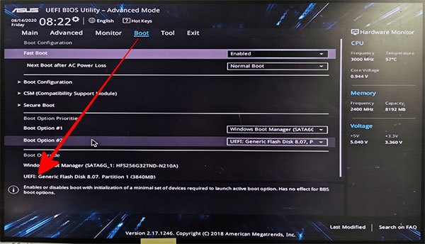 进入bios 控制视窗后,选择刚刚建立好的开机usb 来启用系统;