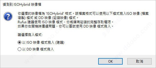 然后会看到一个警告,内容大概就是说明usb 中的所有资料将会被格式化,若有重要资料的话请先进行备份,接着选择「以iso 映像模式写入(建议)」后按下ok;