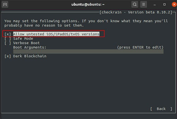 然后选择allow untested ios/ipados/tvos versions 然后点击下方back 回到上一页,最后按下start 开始越狱即可;