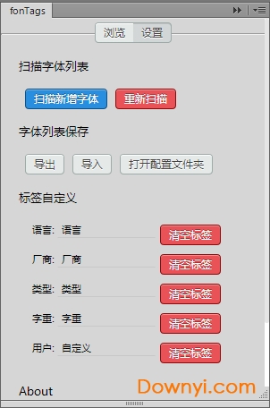 第一次使用时 fontags 会扫描当前计算机中已经使用安装的字体,如果没有扫描或者需要重新扫描,可以在设置页面点击 “重新扫描”,要注意的是“重新扫描”会丢失当前字体列表,如果是要扫描新增字体,请使用“扫描新增字体”。