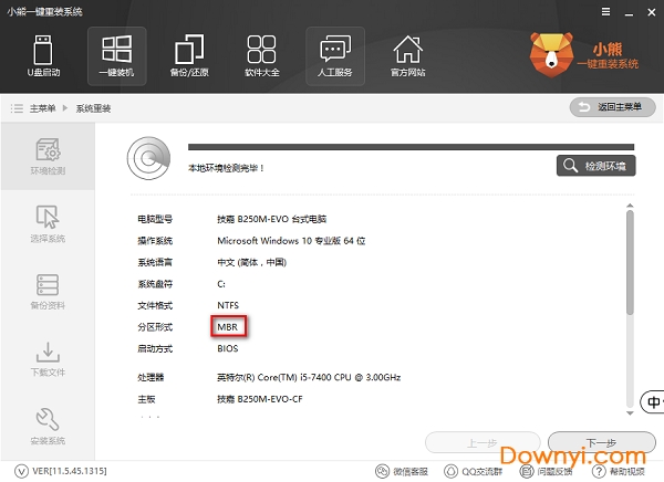 2.点击之后就会进行检测,注意了你们要是不知道怎么看你的硬盘分区格式的下面检测的分区形式有标明的。我这里是mrb模式,所以也就是说我这台电脑启动的方式为legacy。好了点击下一步。