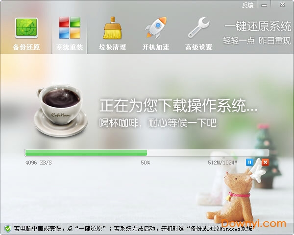 如果您的系统已经中毒、运行很卡很慢,且之前没有备份过,以致无法还原,可以使用“一键重装”功能