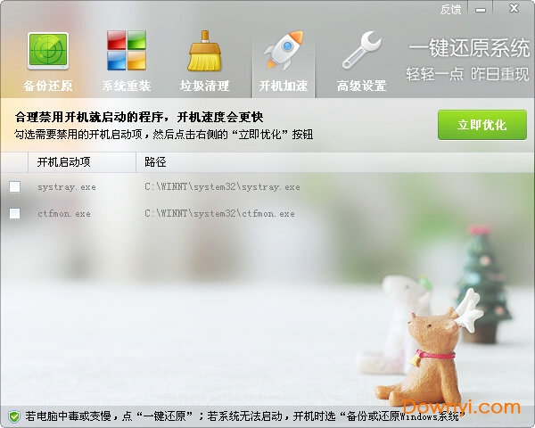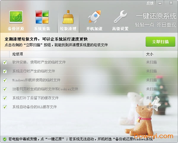 为了让您的系统在备份前就达到最佳状态,“一键还原系统”还提供了“垃圾清理”和“开机加速”两个功能,用于优化您的系统