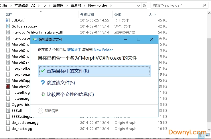 4、找到原程序根目录所在位置,然后把本站提供的修改补丁拉过去就会弹出一个窗口,选择"复制和替换"。