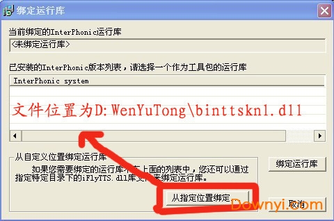接下来会要求绑定运行库。点选择邦定文件位置为D盘中的WenYuTong文件夹中的bin文件夹中的ttsknl.dll。如下图所示。