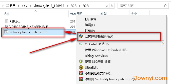 1.解压压缩包里面的r2t.zip压缩包,进入文件夹,使用管理员身份运行virtualdj_hosts_patch.cmd,如图: