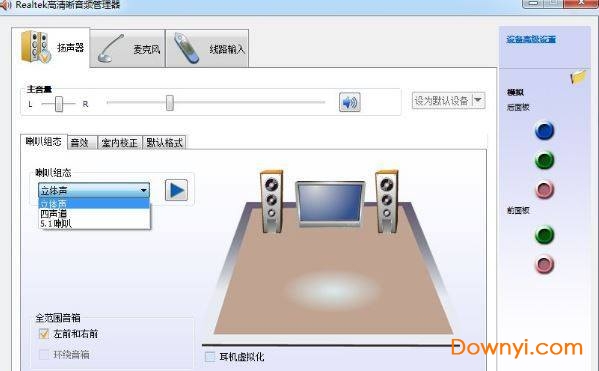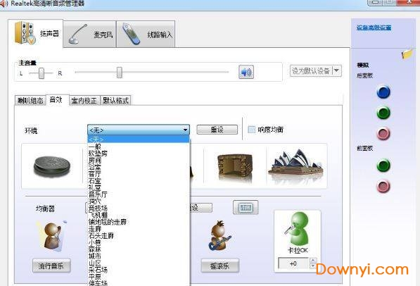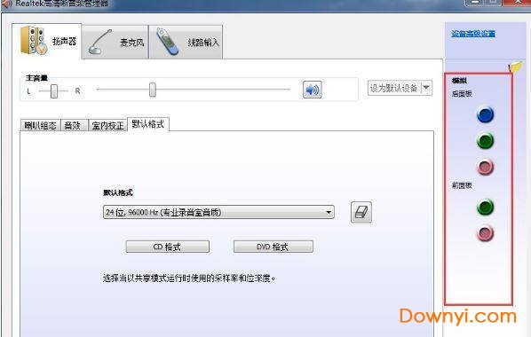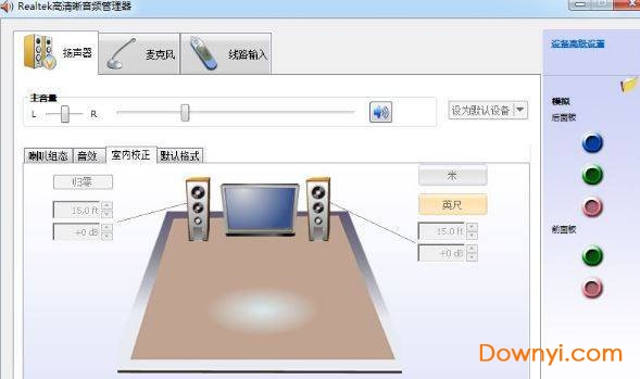 2、打开后,我们会看到设置面板,分别有扬声器、麦克风等设置大项,在扬声器设置项中我们可以调节音量、喇叭组态、音效、室内校正、默认格式等,这些设置按个人喜好设置。