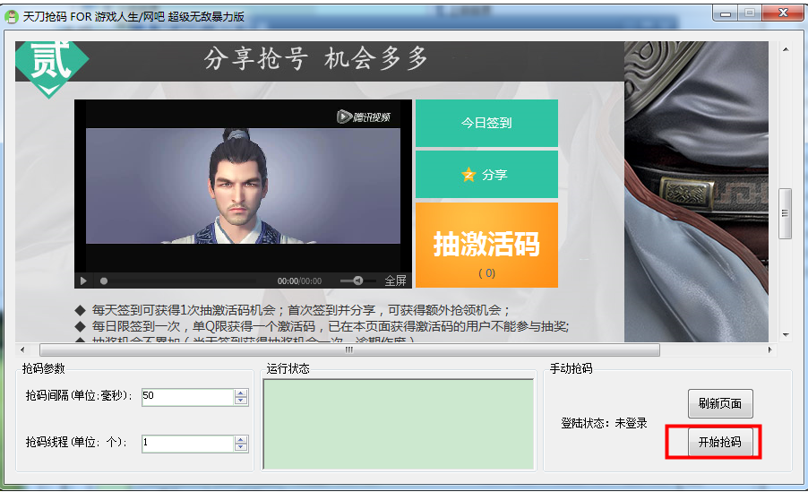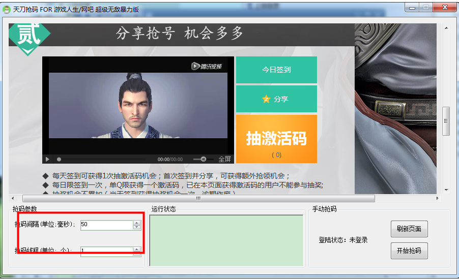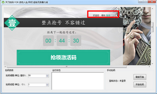 天涯明月刀游戏人生暴力抢码工具是一款专门为用户提供的游戏抢取激活码工具软件,让你快速抢到激活码,让你迅速进入游戏!但是玩家需要注意的是每天10点到23点整点开抢哦,有需要的赶紧下载哦!