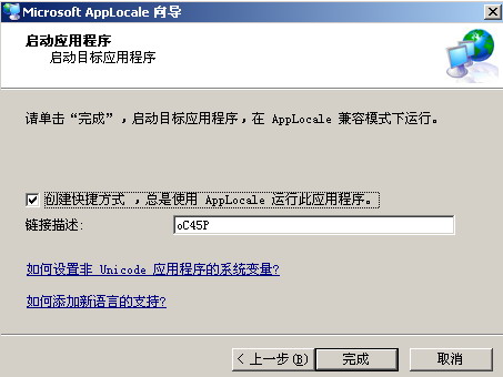 再下一步主要是你是否要保存Applocale对你现在所设置的软件的语言转换设置保存并建立一个快捷键,这样就不用每次要重新启动Applocale对软件进行乱码转换设置了。以后只要点击快捷键按照以前的设置就可以直接转换并使用软件。