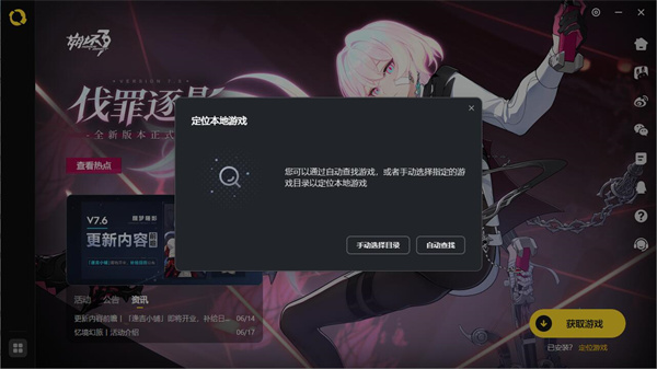 4、如果你电脑上已经下载了各种米哈游游戏,那么就可以点击【定位游戏】找到游戏的位置,这样就可以直接关联到平台上,直接体验。