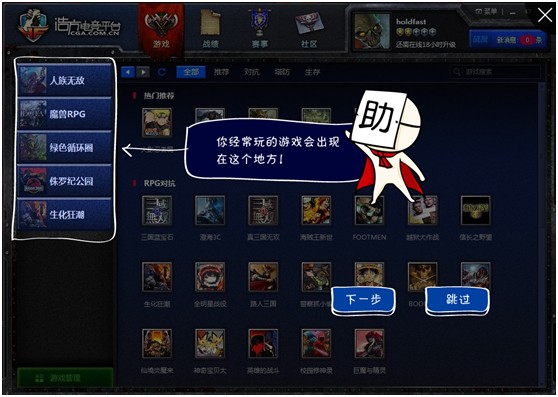 独有个性游戏管理,自选游戏操作,玩家可以依照自己习惯的游戏设置重新编辑平台左侧最近游戏栏,即时调整最近游戏排序,以便玩家最快速的点击进入自己喜爱的游戏,免除玩家每次进入游戏前所要寻找游戏进入的麻烦。
