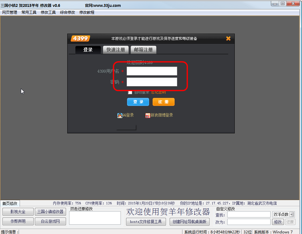 三国小镇2贺2015羊年修改器是4399游戏《三国小镇2》最新的辅助工具。软件功能强大,支持攻击修改、无限法力、无限无双、秒升级等功能。通过修改器,可以修改爆率,可以帮助玩家刷各种极品装备。赶快下载体验吧!