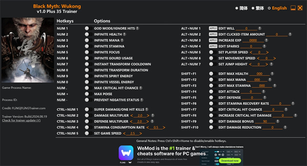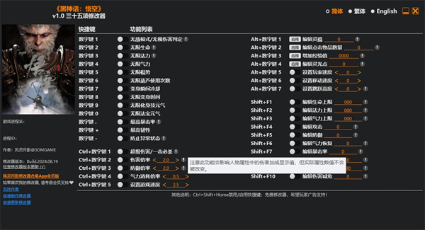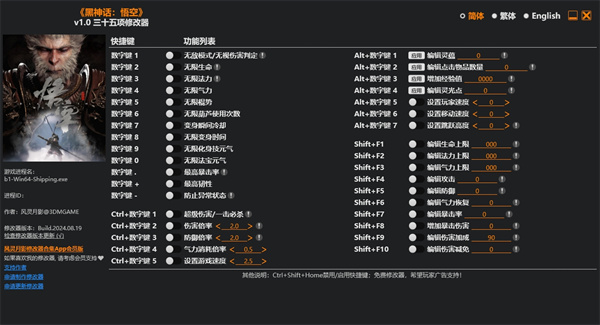 黑神话悟空三十五项修改器作为专业的风灵月影修改器软件,能够帮助各位大圣度过难关,不至于出现打不过去的情况,毕竟游戏体验感还是要有的,除了精彩的剧情之外,最有趣的就是打斗体验,所以很重要的能打过BOSS才行,才能解锁后续的内容,在修改其中会有三十多项可以修改的功能,后续还将会添加更多的修改功能,并且支持一键开启一键关闭,非常便捷的操作,让每位天命人可以不影响游戏操作,在酣畅淋漓的战斗过程中也可以开启辅助。