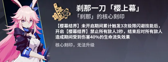 刹那(樱):本篇攻略多次强调今样缺伤害,需要再选一些补强输出的BUFF。今样的爆发比较集中,所以可以吃全仅持续3秒的【樱上幕】BUFF,提供的额外40%生命流失效果能给予今样不错的输出补强,但由于今样没有主动触发闪避的方式,建议降低难度后考虑选取。