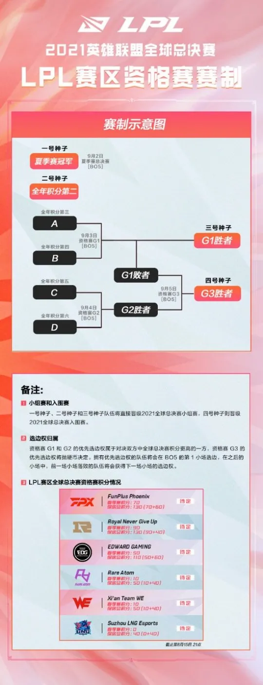 今年全球总决赛资格赛将在夏季总决赛结束后进行。除了LPL赛区的一号种子队伍(夏决冠军)与二号种子队伍(除夏决冠军外全年积分最高者)以外,其他队伍中全球总决赛积分排名最高的4名队伍将进入全球总决赛资格赛(如果积分相同,夏季赛积分更高的队伍排名更高)。