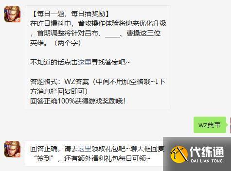 题目:在昨日爆料中,普攻操作体验将迎来优化升级,首期调整将针对吕布、_____、曹操这三位英雄。