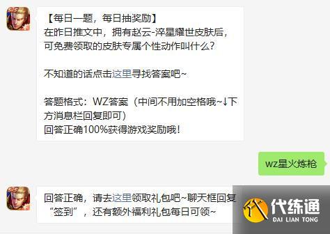 题目:在昨日推文中,拥有赵云-淬星耀世皮肤后,可免费领取的皮肤专属个性动作叫什么?