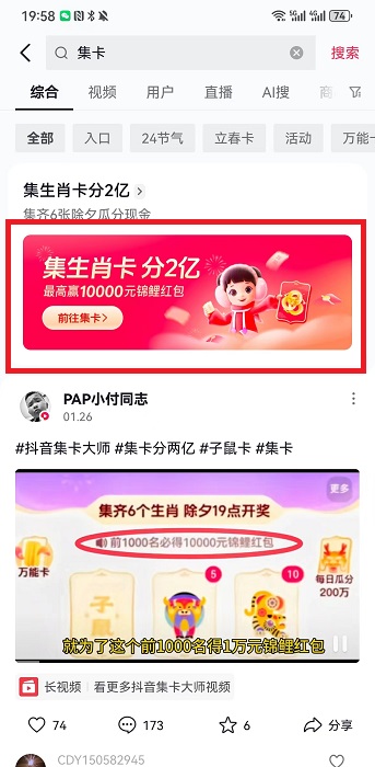 1、在抖音中搜索【集卡分两亿】然后去进行搜索,在搜索结果中点击下方的活动,进入到活动界面中;