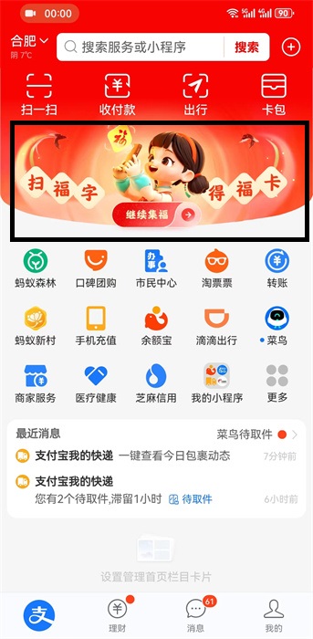 1、打开支付宝,在支付宝的首页界面中点击上面的活动,进入到集福活动之中;