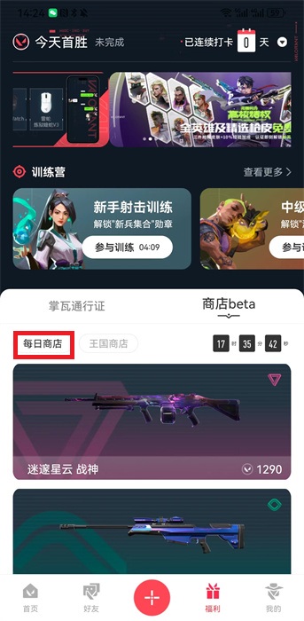 掌上无畏契约是无畏契约的的助手,这是非常好的战绩查询工具,我们能够在这里看到非常多的资讯内容,也会有更多的活动等你来参与,其中就会有一个每日商店的功能,很多用户想要知道掌上无畏契约怎么看每日商店,下面给大家分享一下掌上无畏契约查看每日商店教程。