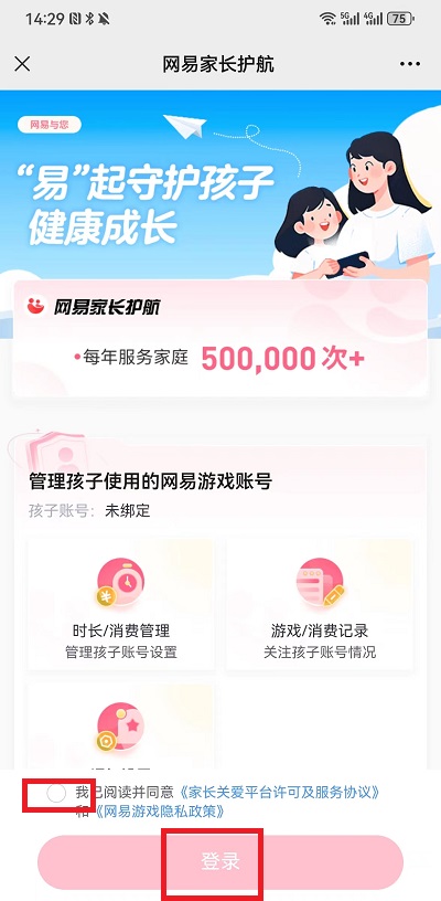 2、在管理界面,需要登录家长的网易账号,需要点击勾选【阅读同意条款】、【登录】按钮登录家长的网易账号;