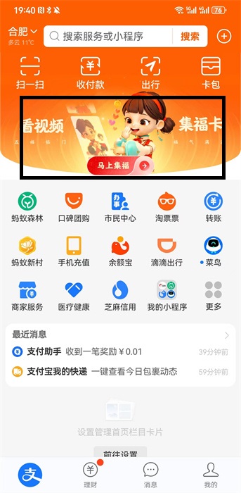 1、需要把支付宝更新到最新版本,这样才会出现最新的集福活动,然后打开软件,就可以进入软件首页,在首页就可以看到上方的活动,点击活动进入到集五福中;