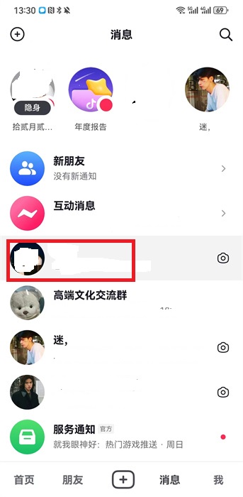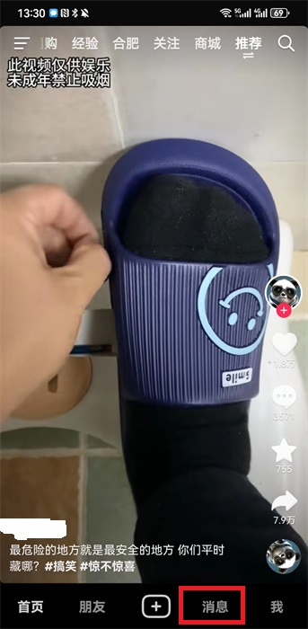 1、想要取消好友之间的密友关系,可以从设置的方式去进行取消,进入到抖音中,点击右下方的【消息】;