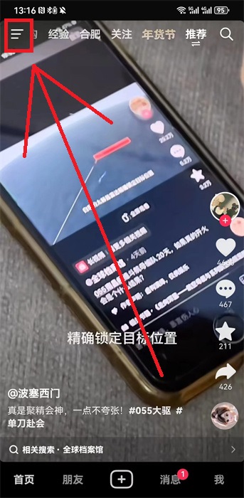 1、在抖音中,我们正在刷视频的话,可以点击左上角的【三】,直接弹出功能界面;